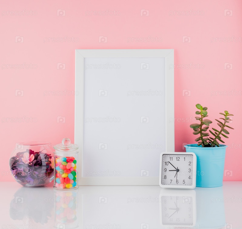 Пустая белая рамка и кактус, сладкие конфеты в банке на белом