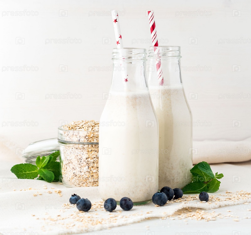 Смузи с овсянкой, мятой для здорового завтрака. Овсяное молоко в стеклянной бутылке с трубкой на белом фоне. Избирательный фокус