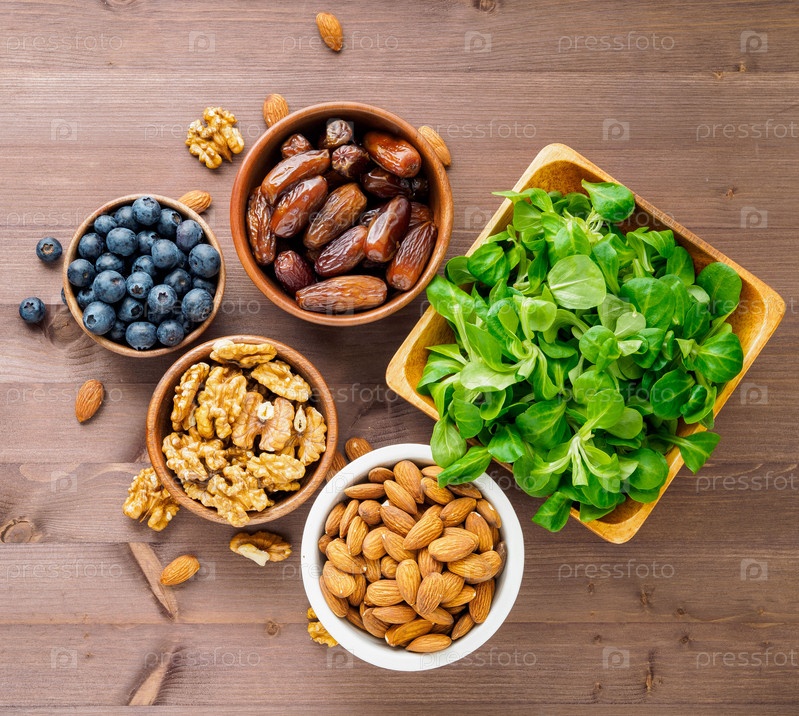Здоровая веганская еда - сухофрукты, зелень, орехи, ягоды. Суперпродукты на коричневом деревянном фоне, вид сверху