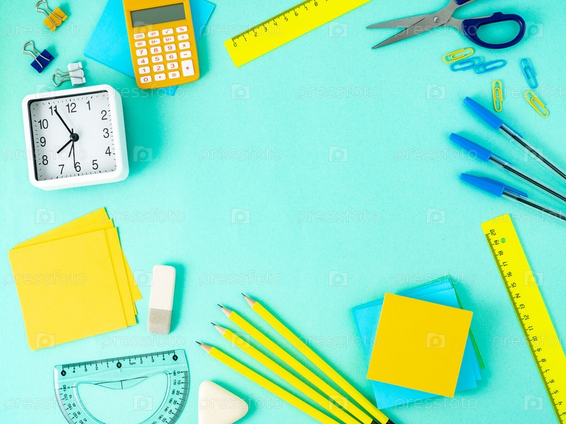 Вид сверху на современный ярко-синий офисный стол со школьными принадлежностями на столе вокруг пустого места для текста. Концепция «Назад в школу»