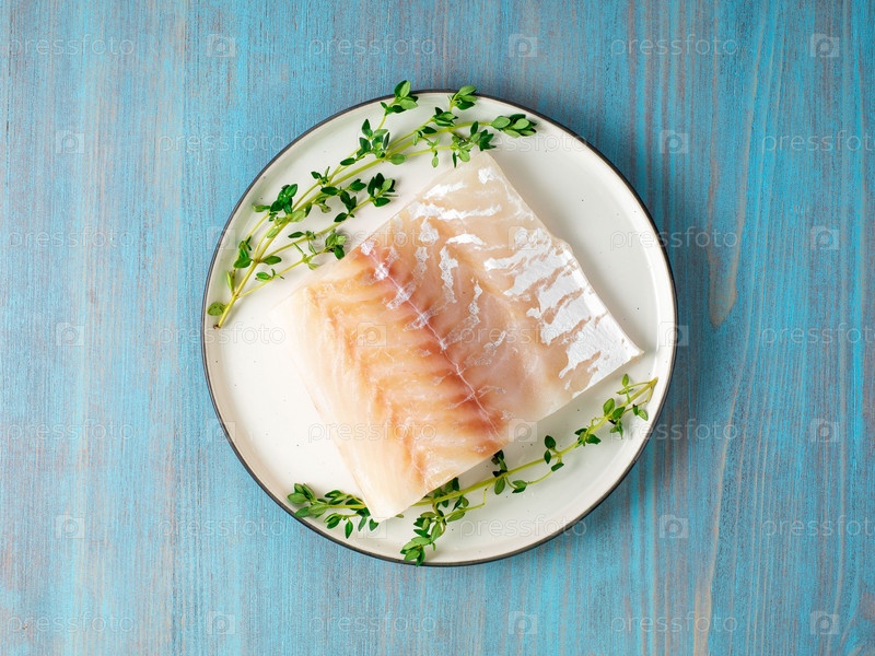 Кусок сырого филе трески на тарелке на синем деревянном столе, вид сверху