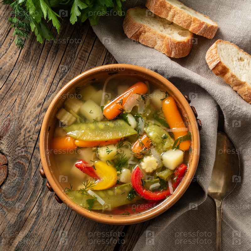Яркий весенний овощной диетический вегетарианский суп. Вид сверху, коричневый деревенский деревянный фон, льняная салфетка