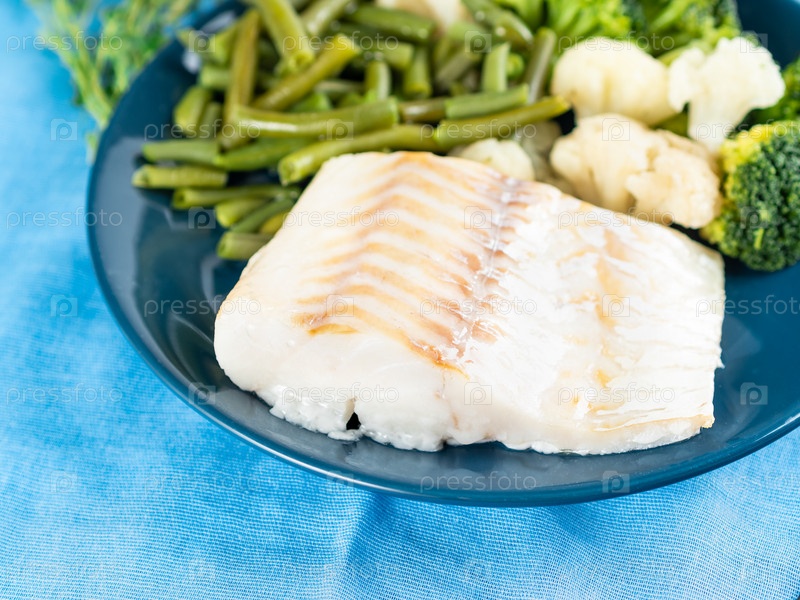 Филе отварной морской рыбы трески с брокколи, зеленой фасолью и цветной капустой на синей тарелке, вид сбоку, близко. Здоровое диетическое блюдо для правильного питания