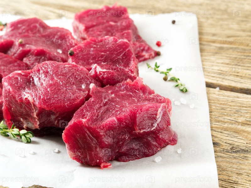 Кусочки сырого мяса. Сырая говядина со специями на белой пергаментной бумаге на деревянном грубом деревенском фоне, вид сбоку, крупный план