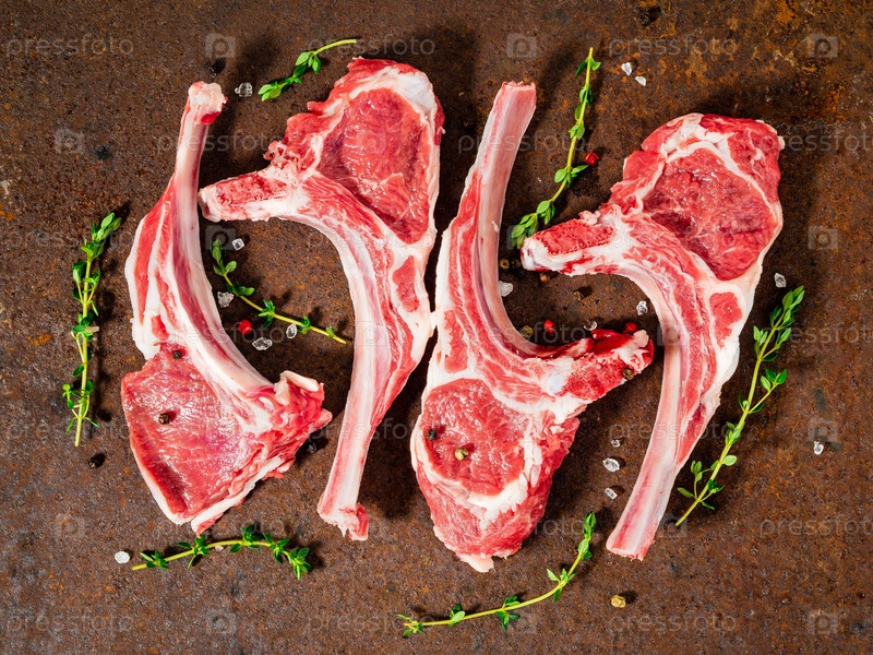 Сырые бараньи котлеты на кости на темном металлическом фоне, вид сверху, крупный план