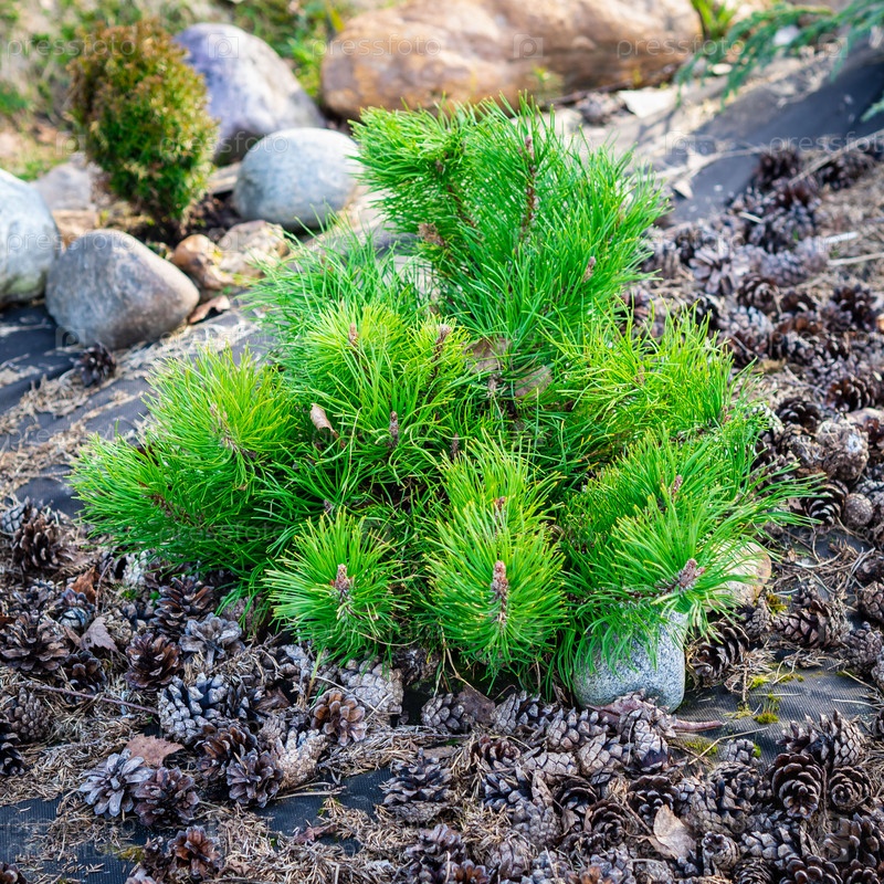 Карликовая сосна, семейство хвойных, на фоне сосновых шишек