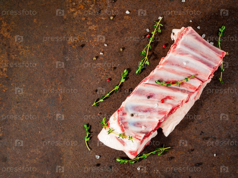 Сырые бараньи ребрышки на темном металлическом фоне, вид сверху, пустое пространство