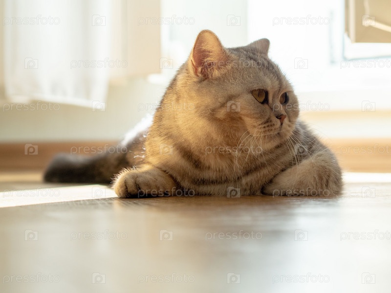 Кот лежит на полу, взгляд направлен в сторону, из окна луч солнца