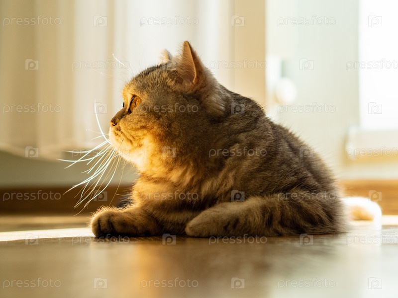 Кот лежит на полу, взгляд направлен в сторону, солнечный луч из окна, контурный свет