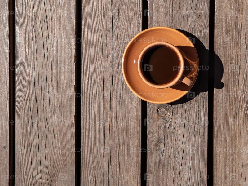 Коричневая кофейная чашка на деревянном столе, солнечный день, естественная тень, вид сверху