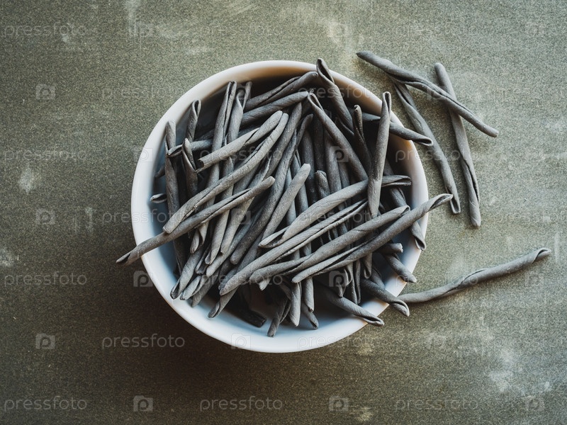 Сухая сырая паста с чернилами каракатицы на сером фоне