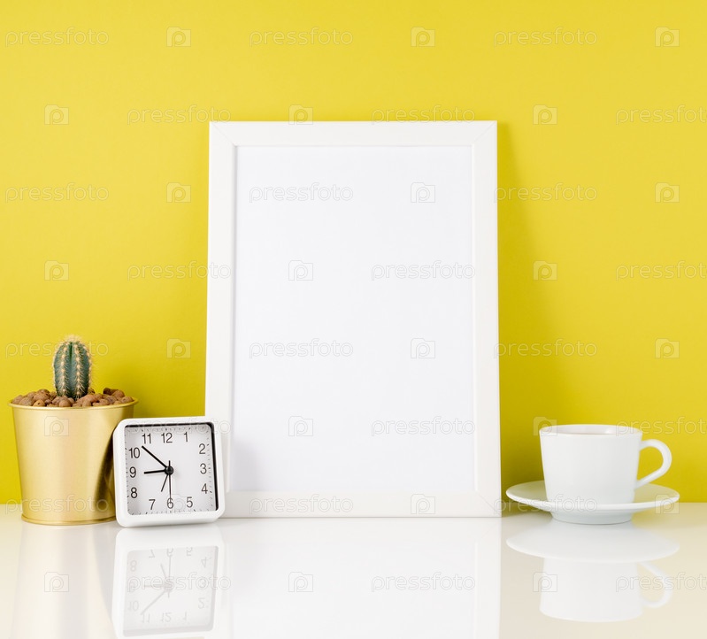 Пустая белая рамка, часы, суккулент, кружка с чаем или кофе на фоне желтой стены. Макет с копировальным пространством