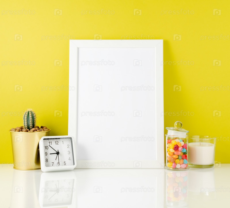 Пустая белая рамка, часы, сочные, конфеты на белом столе на фоне желтой стены. Макет с копировальным пространством