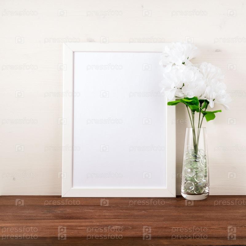 Белая рамка, цветок в стеклянной бутылке на темно-коричневом деревянном столе на фоне белой стены с местом для копирования. Макет