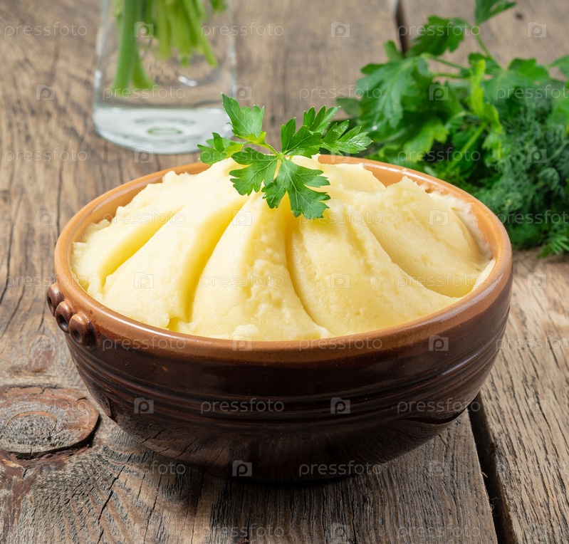 Картофельное пюре, вареное пюре в коричневой миске на темном деревянном деревенском фоне, вид сбоку