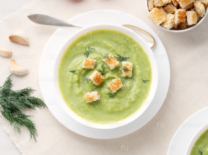 Большая белая миска с овощным зеленым крем-супом из брокколи, цуккини, зеленого горошка на белом