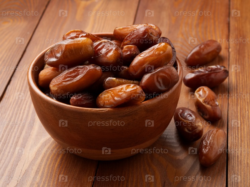 Финики, сухофрукты в деревянной миске. Традиционная еда Ближнего Востока, Северной Африки. Вид сбоку, деревянный фон