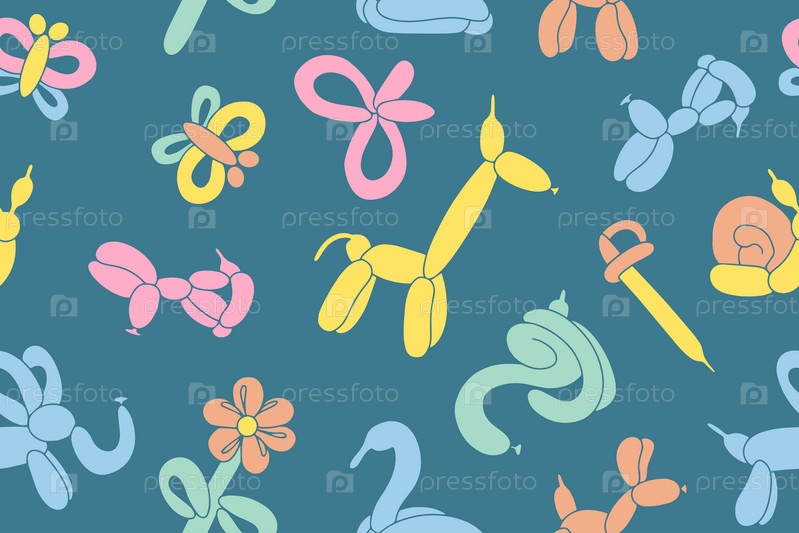 Бесшовный узор из разноцветных шаров. Красочный рисунок надувных игрушек из скрученных шаров. Элемент дизайна для упаковки, поздравительной открытки, пригласительного билета, печати, флаера, баннера. Вектор