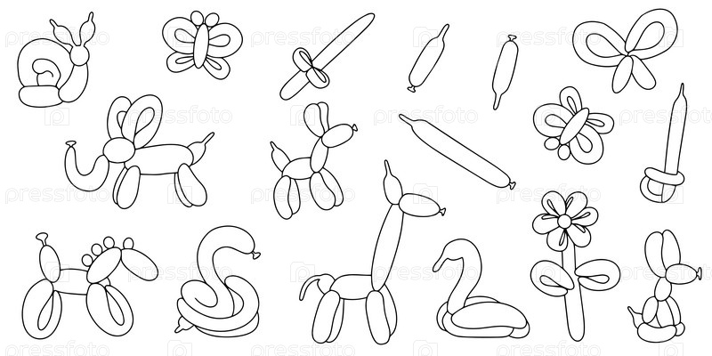 Набор надувных игрушек из скрученных шаров в стиле doodle. элемент дизайна для поздравительной открытки, пригласительного билета, печати, флайера, баннера. вектор