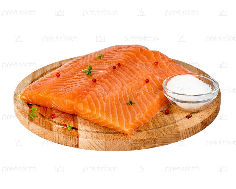 Свежее филе лосося на деревянной разделочной доске на белом фоне, вид сбоку