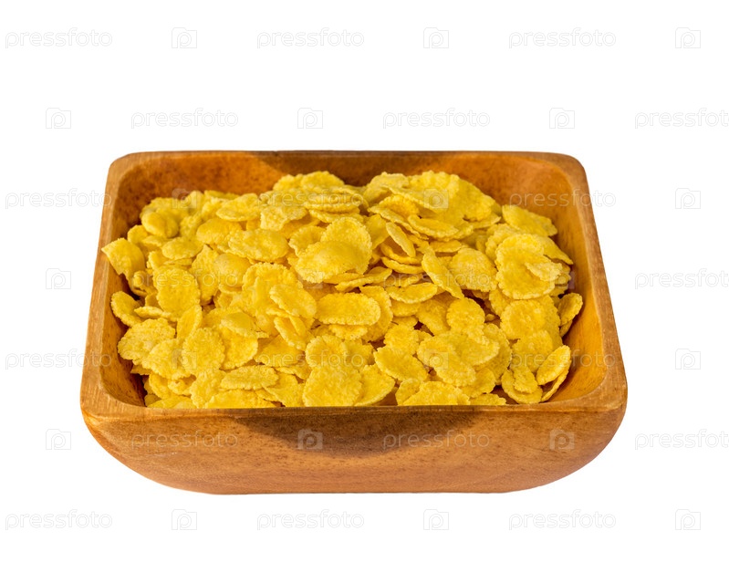 Деревянная миска с сухими хлопьями на завтрак, вид сбоку, белый фон
