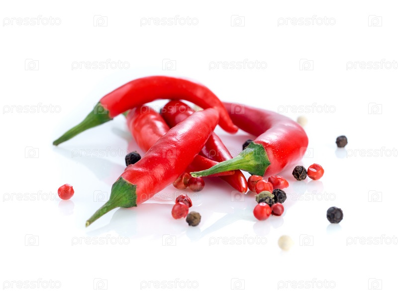 Красный кайенский перец и перец горошком на белом фоне, вид сбоку