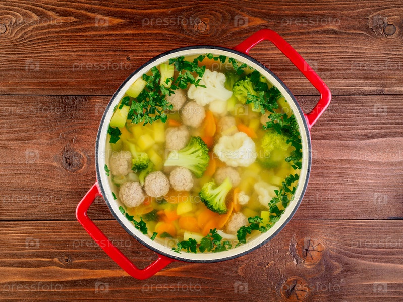 Большая металлическая литая красная кастрюля с вкусным горячим супом из овощей и фрикаделек, цветной капустой, брокколи, морковью, перцем, картофелем, здоровой диетической едой. Коричневый деревянный стол, вид сверху