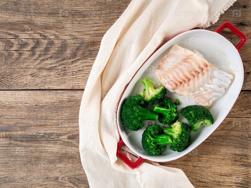 Рыба треска запеченная в духовке с брокколи - здоровое питание здоровое питание. Деревенский деревянный коричневый фон, вид сверху, копия пространства
