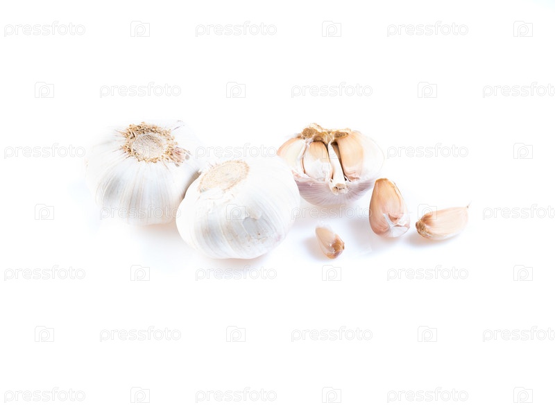 Зубчик чеснока на белом фоне, луковицы, вид сбоку