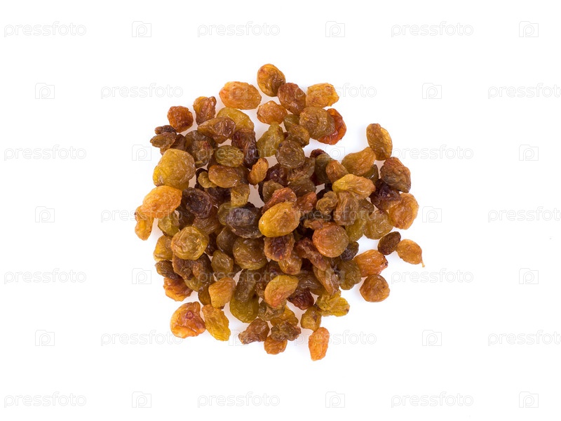 Большая горсть изюма на белом фоне. Много сушеного винограда, изолировано, вид сверху, крупный план