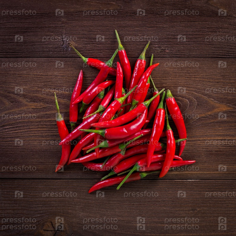 Красный острый перец чили на темном деревянном фоне, вид сверху