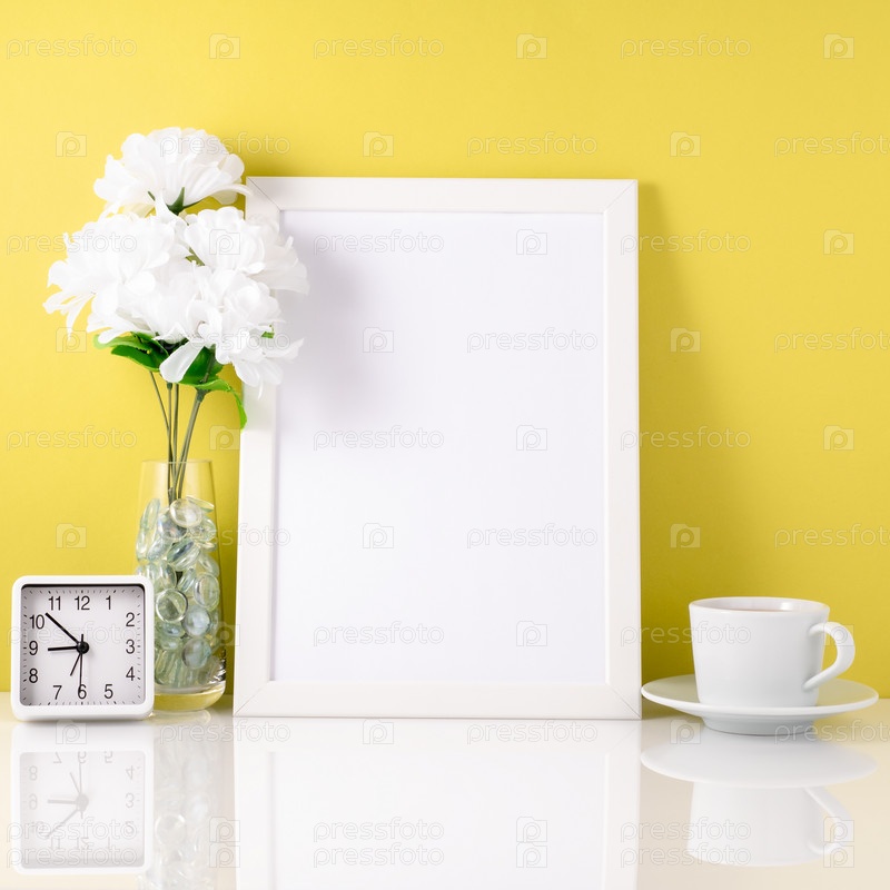 Белая рамка, цветок в вазе, чашка с чаем или кофе, часы на белом столе на фоне желтой стены с местом для копирования. Макет