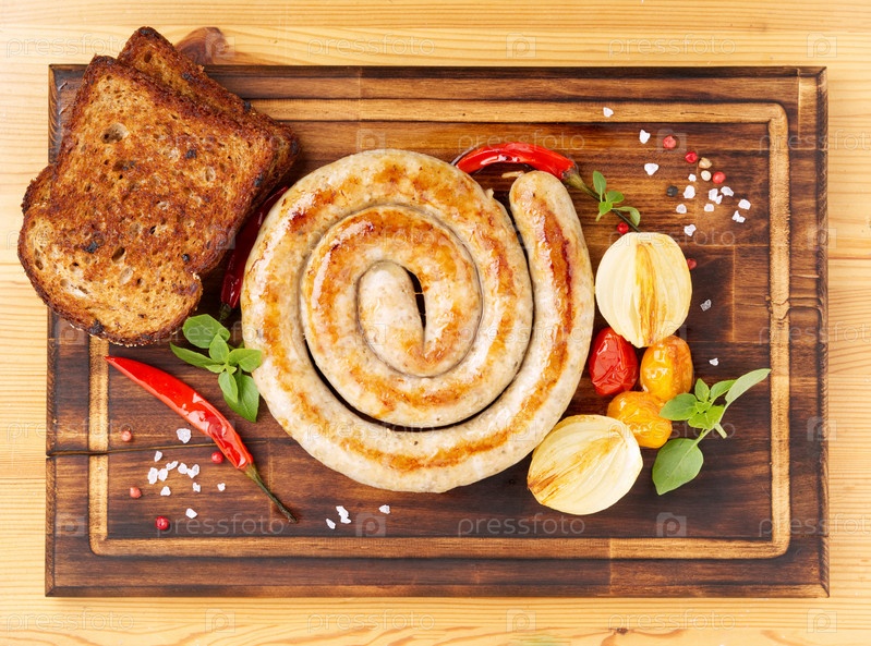 Домашняя жареная колбаса, спиральной формы, с овощами луком, перцем и помидорами, хлеб на темной деревянной разделочной доске, вид сверху