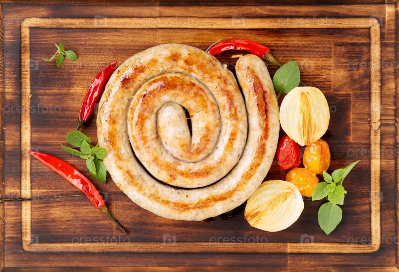 Домашняя жареная колбаса, спиральной формы, с овощами луком, перцем и помидорами на темной деревянной разделочной доске, вид сверху
