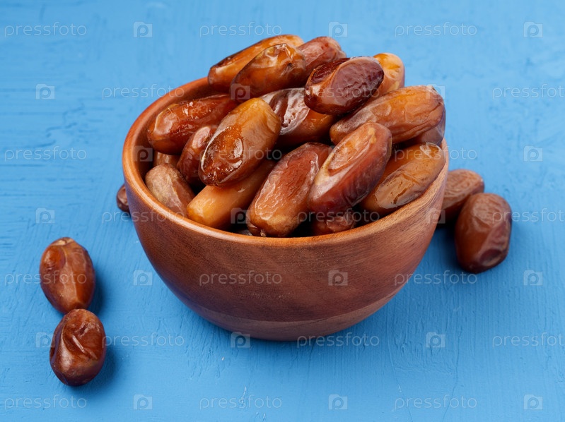 Финики, сухофрукты в миске. Традиционная еда Ближнего Востока, Северной Африки. Вид сбоку, ярко-синий деревянный фон