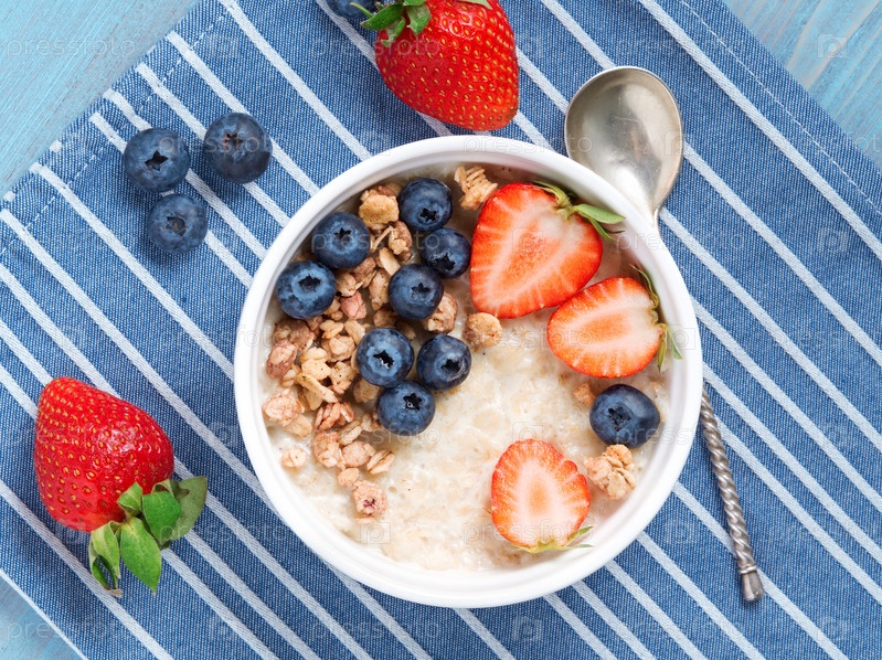 Овсяная каша со свежей клубникой, черникой, гранолой на синем фоне. Здоровый завтрак. Вид сверху, крупный план