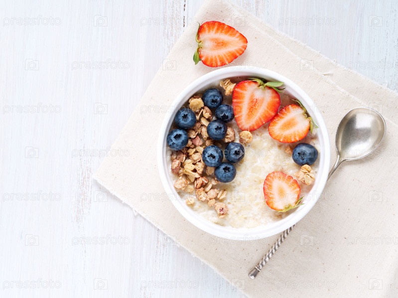 Овсяная каша с клубникой, черникой, гранолой на белом деревянном фоне. Здоровый завтрак. Вид сверху