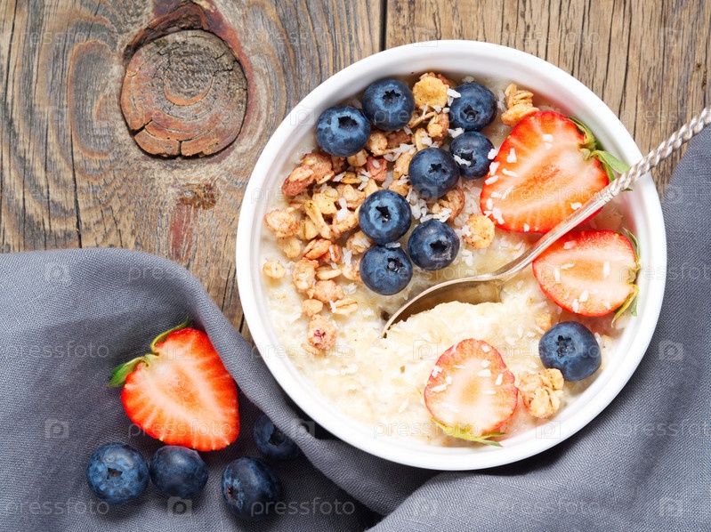 Овсяная каша со свежей клубникой, черникой, гранолой на старом деревенском деревянном фоне. Здоровый завтрак. Вид сверху