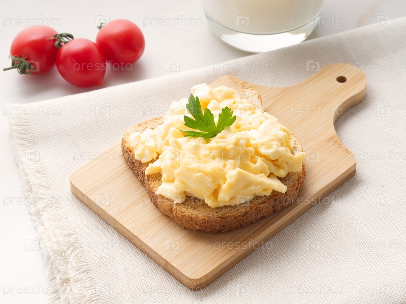 Сэндвич с жареной яичницей на деревянной разделочной доске, вид сбоку