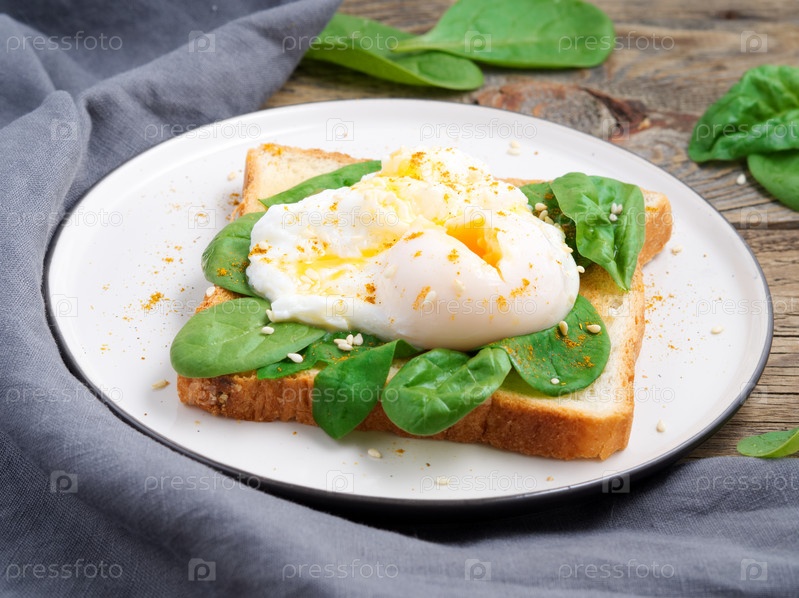 Здоровый завтрак с тостом и яйцом пашот с зеленым салатом, шпинатом. Вид сбоку