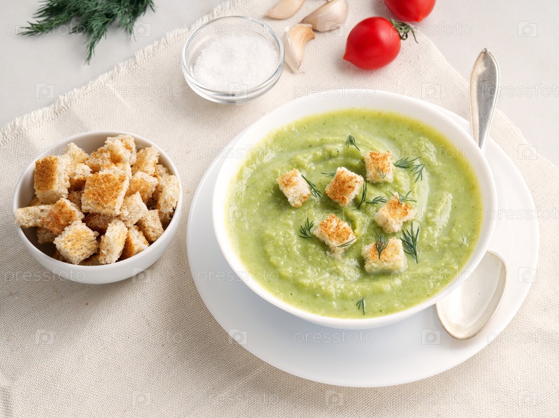 Большая белая миска с овощным зеленым крем-супом из брокколи, цуккини, зеленого горошка на белом фоне, вид сбоку