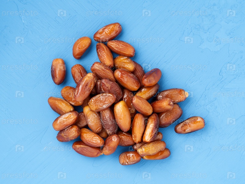 Финики, куча сухофруктов. Традиционная еда Ближнего Востока, Северной Африки. Вид сверху, ярко-синий деревянный фон