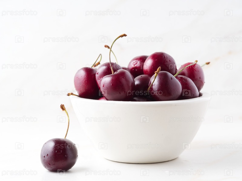 Красная темная черешня в белой миске на каменно-белом столе, вид сбоку