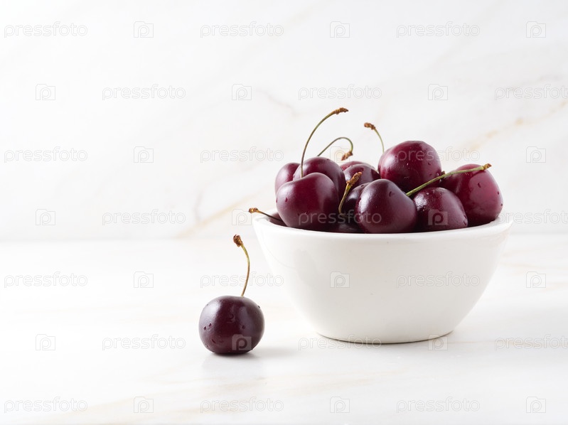 Красная темная черешня в белой миске на каменно-белом столе, вид сбоку, место для копирования