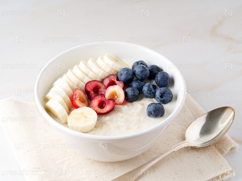 Большая миска вкусной и полезной овсянки с фруктами и ягодами на завтрак, утренний прием пищи. Вид сбоку, белый мраморный стол
