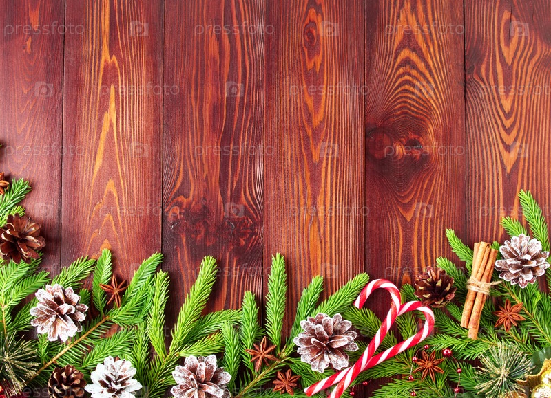 Рождество и Новый год темно-коричневый фон. Вид сверху, пространство для копирования, деревянный деревенский