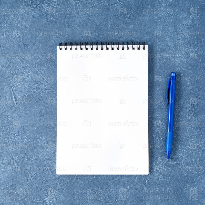 Открытый блокнот с чистой белой страницей на состаренном темно-синем каменном столе, вид сверху