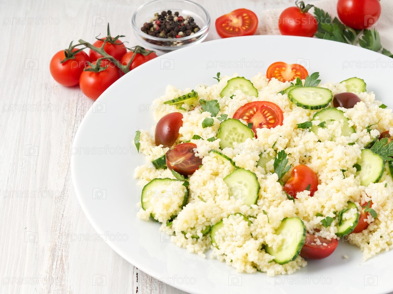 Свежий диетический овощной салат с кускусом, помидорами, огурцами, петрушкой, белый деревянный стол, вид сбоку
