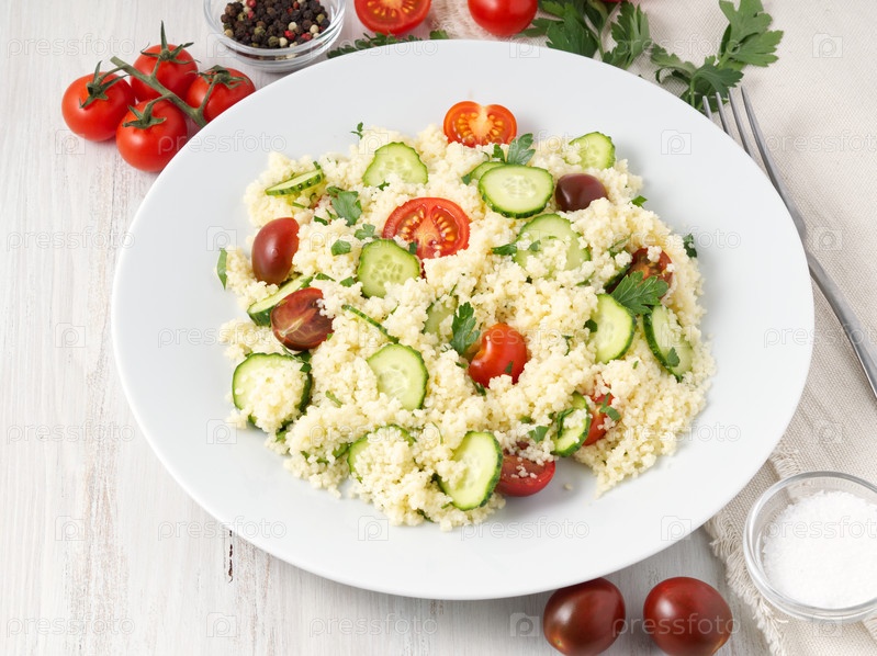 Свежий диетический овощной салат с кускусом, помидорами, огурцами, петрушкой, белый деревянный стол, вид сбоку