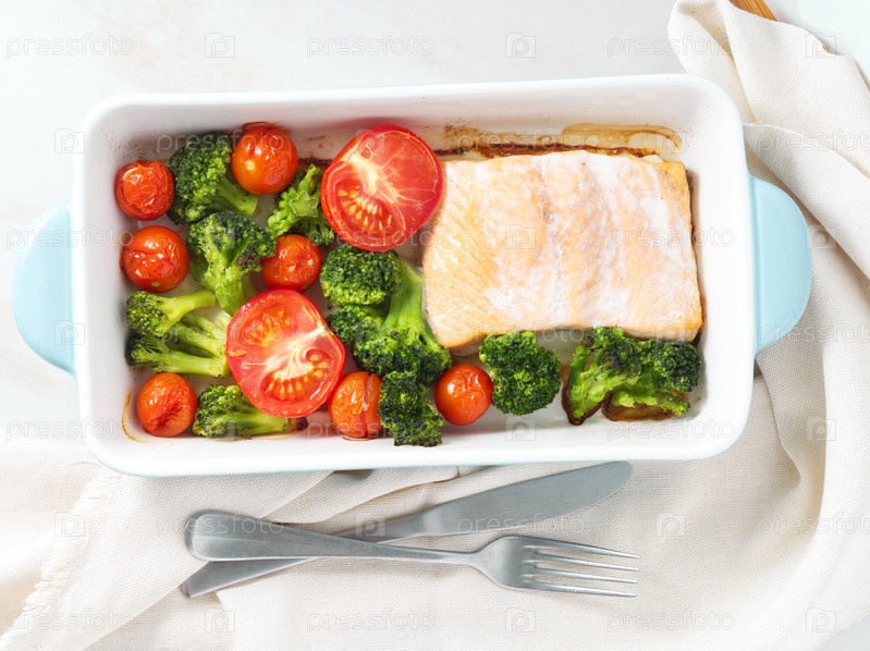 Рыба лосось запеченная в духовке с овощами - брокколи, помидорами. Здоровое диетическое питание, белый мраморный фон, вид сверху